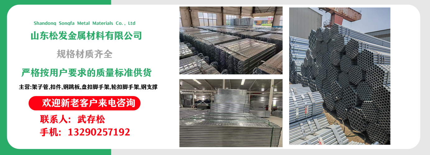 山東松發金屬材料有限公司主營架子管,扣件,鋼跳板,盤扣腳手架,輪扣腳手架,鋼支撐生產廠家。本廠專業生產銷售。  建筑用架子管、 主要用于房建,橋梁,鐵路,公路,地鐵,水庫,隧道,支撐。  架子管,扣件,鋼跳板,盤扣腳手架,輪扣腳手架,鋼支撐的優越性及應用“ ”產品因具有結構簡單合理、設計巧妙、使用方便、安全、快捷、易于運輸、儲存、維護簡單等特點?! 」疽回瀳猿帧百|量,用戶至上,優質服務,信守合同”的宗旨,憑借著高質量的產品,良好的信譽,優質的服務,產品暢銷全球。歡迎廣大客戶來電洽談,共同發展,共創輝煌!  山東松發金屬材料有限公司秉承誠信服務、恪守信譽的宗旨,在同等的質量下,保證以最低的價格,最完善的服務,最高的信譽來答謝各界朋友的支持和厚愛,歡迎您的來電、咨詢,我們將竭誠為您服務!...